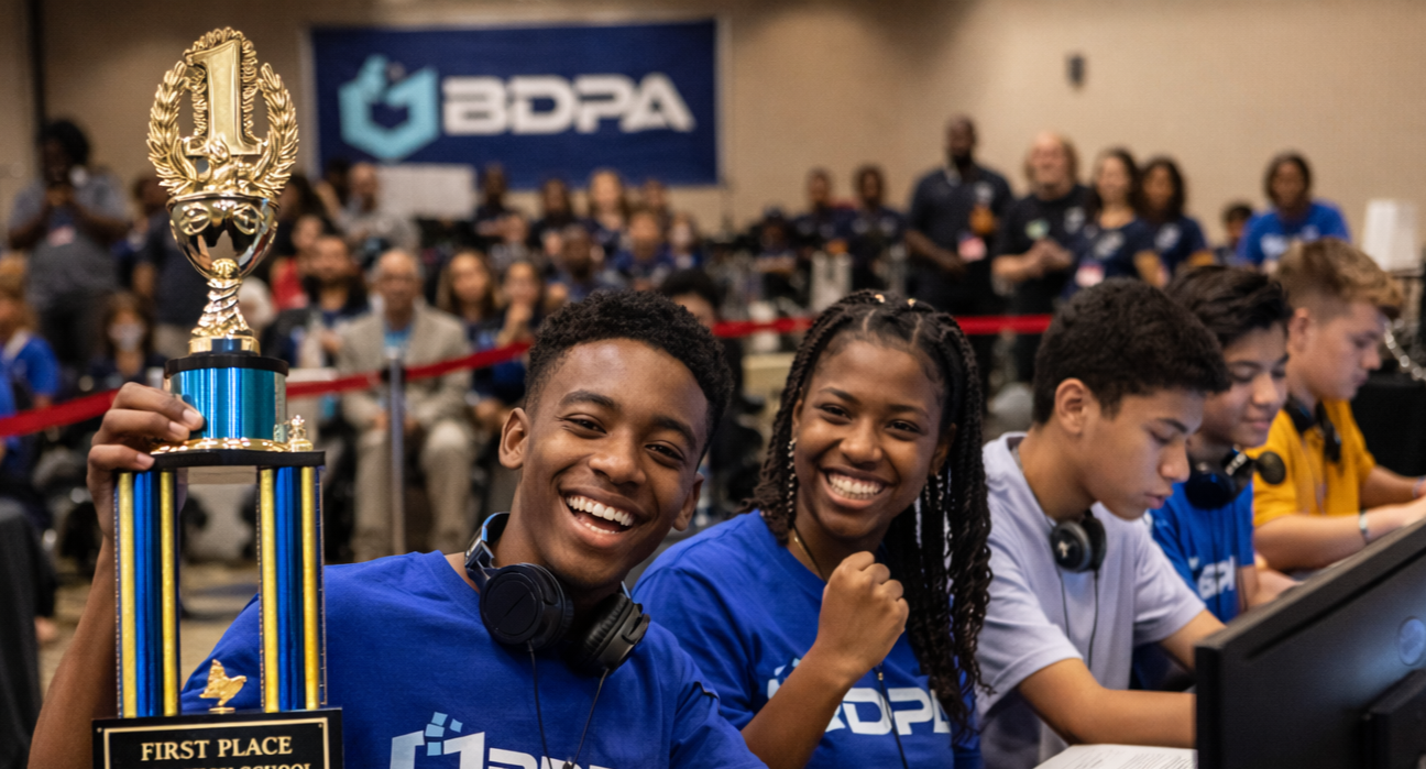 Each year, standout students from our High School Technology Program (HSTP) are selected to participate in an intensive training experience designed to prepare them for BDPA’s National High School Coding Competition, where students from chapters across the United States compete in a high-level programming challenge.